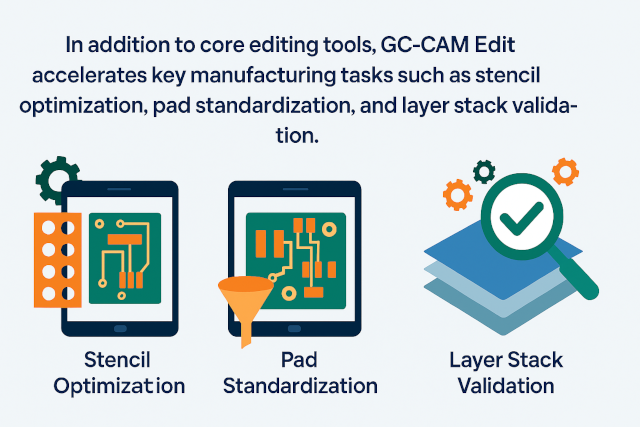 GC-CAM Edit meets the needs of PCB designers and CAM operators who require convenient design modification capabilities. It features all the powerful panelization and editing tools necessary for PCB photoplotting, drill and rout, stencil manufacturing, and basic design modification.